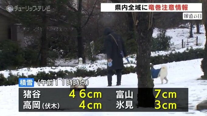 各地の積雪は猪谷で46センチ、富山で7センチ、高岡市の伏木で4センチなどとなっています。