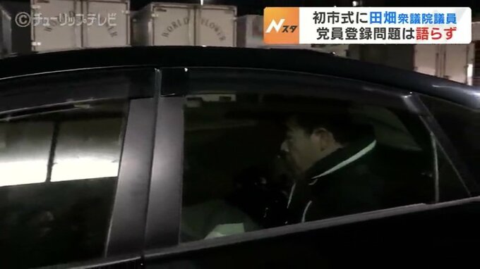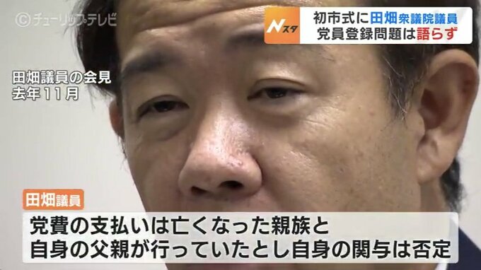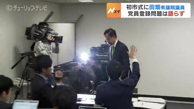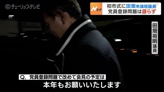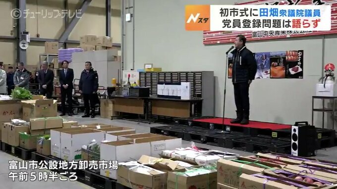 5日朝、富山市の卸売市場でおこなわれた初市式に自民党の田畑裕明衆議院議員が出席しました。終了後、記者の問いかけには応じましたが党員登録問題については語ることなく会場を後にしました。