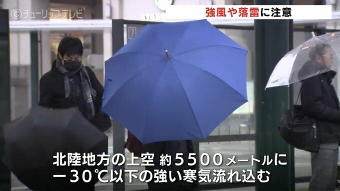 富山県内は前線を伴なった低気圧の影響で広い範囲で雨となっています。日本付近は冬型の気圧配置が強まっていて、北陸地方の上空およそ5500メートルに氷点下30℃以下の強い寒気が流れ込む見込みです。