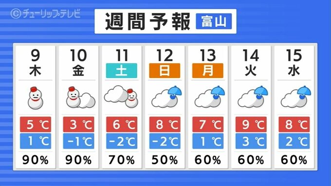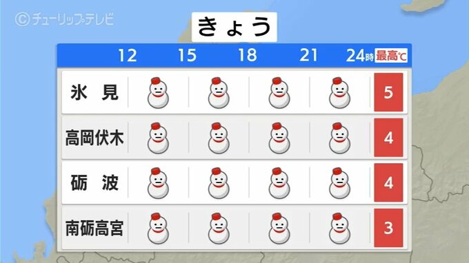 富山県内西部も雪や雨が断続的に降るでしょう。大気の状態が不安定で一時的に雷を伴うところもある見込みです。最高気温は7日より低く日中も震える寒さになるでしょう。暖かくしてお過ごしください。