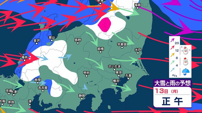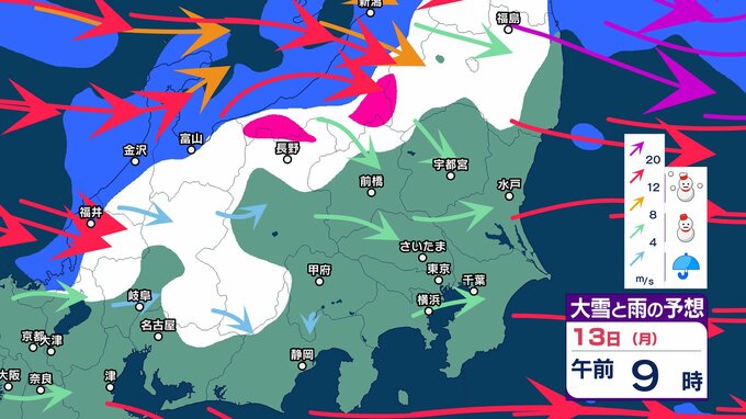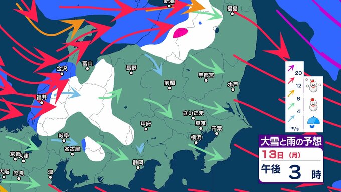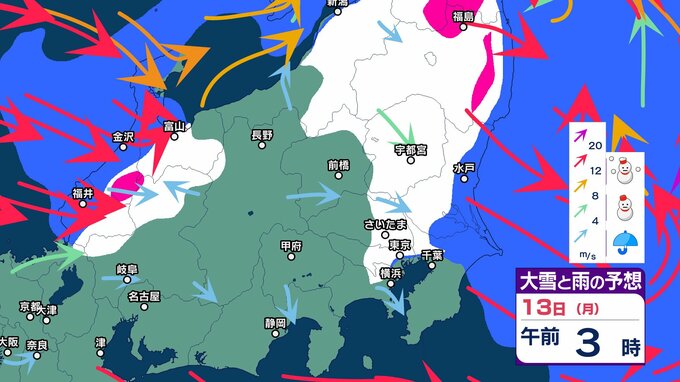 関東 3連休「南岸低気圧」の接近で東京都心など沿岸部では冷たい雨 内陸では雪の可能性 成人の日の朝は路面凍結に注意を【大雪と雨のシミュレーション13日まで】 2025年1月8日(水) 17:50 国内 天気 13日の大雪と雨のシミュレーション