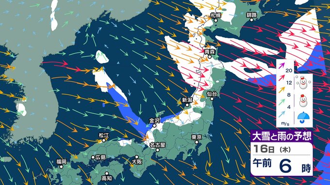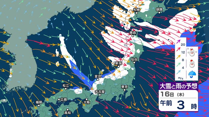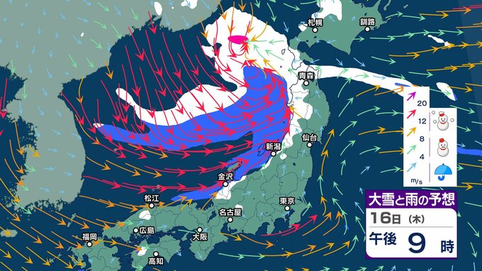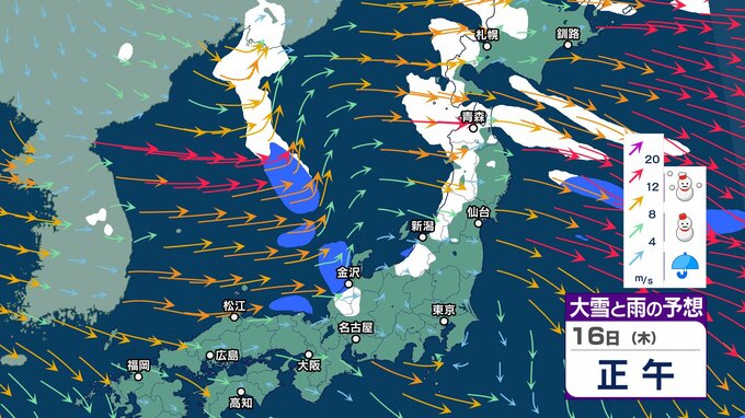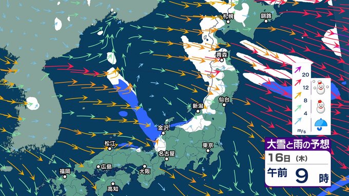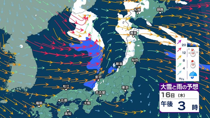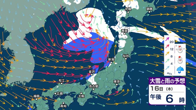 ニュースクリップ 北陸上空にマイナス30℃以下の寒気 “嵐の使者” …落雷や竜巻、激しい突風に注意【気象情報 14日午前7時半】15日にかけ大気の状態が非常に不安定【大雪と雨シミュレーション17日まで】 2025年1月14日(火) 07:56 国内 天気 16日 大雪と雨のシミュレーション