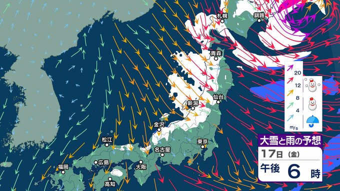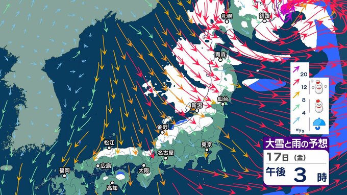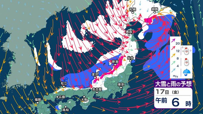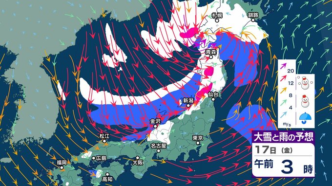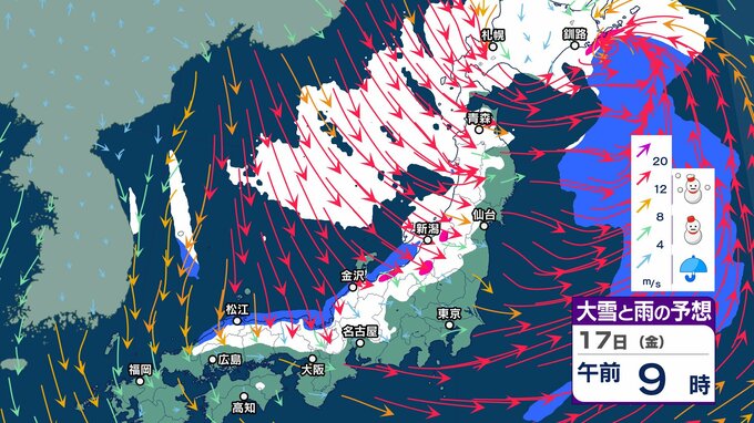 ニュースクリップ 北陸上空にマイナス30℃以下の寒気 “嵐の使者” …落雷や竜巻、激しい突風に注意【気象情報 14日午前7時半】15日にかけ大気の状態が非常に不安定【大雪と雨シミュレーション17日まで】 2025年1月14日(火) 07:56 国内 天気 17日 大雪と雨のシミュレーション