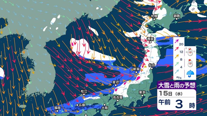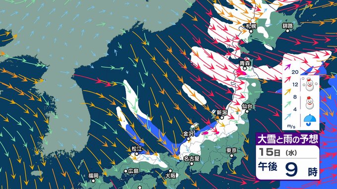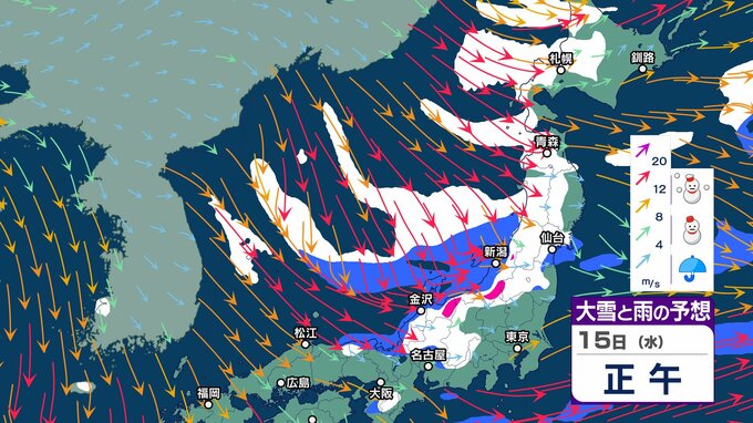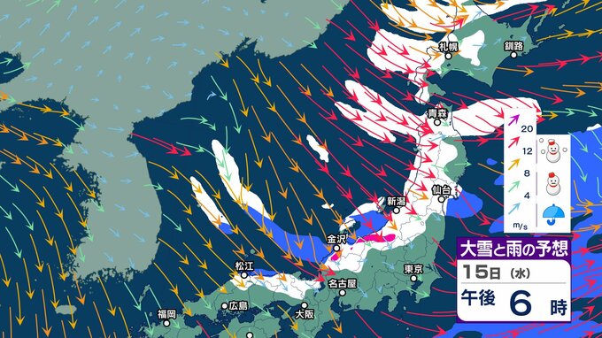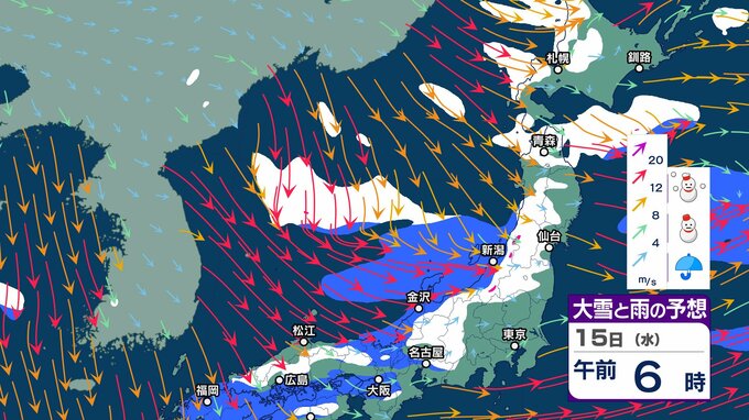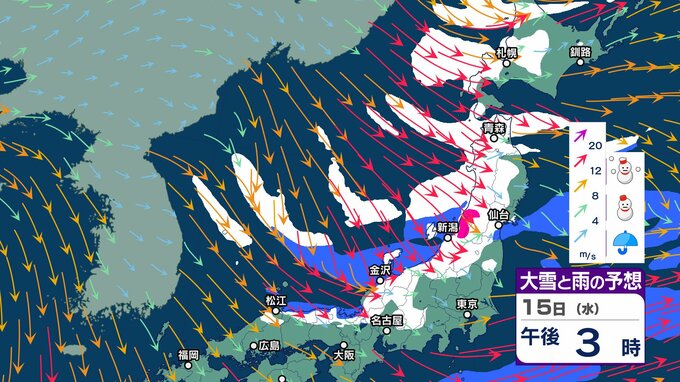 ニュースクリップ 来週は一転…北・東日本・近畿は1月20日ごろから「かなり高く」この時期としては10年に一度程度しか起きないような著しい高温となる可能性 気象庁が「高温に関する早期天候情報」発表 2025年1月14日(火) 15:51 国内 天気 15日 大雪と雨のシミュレーション