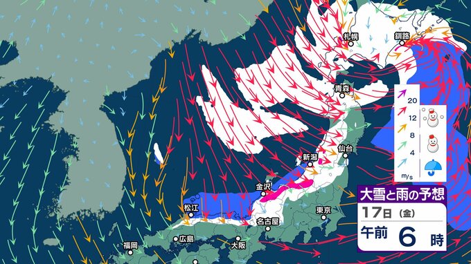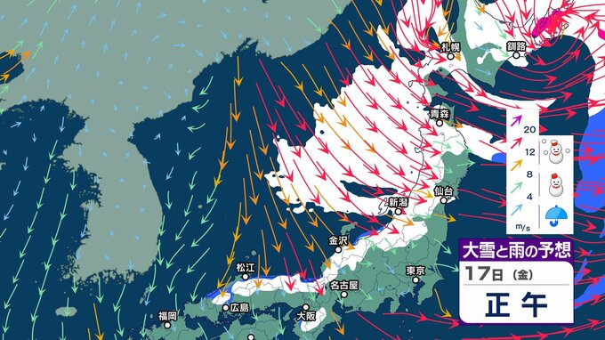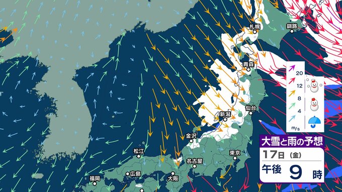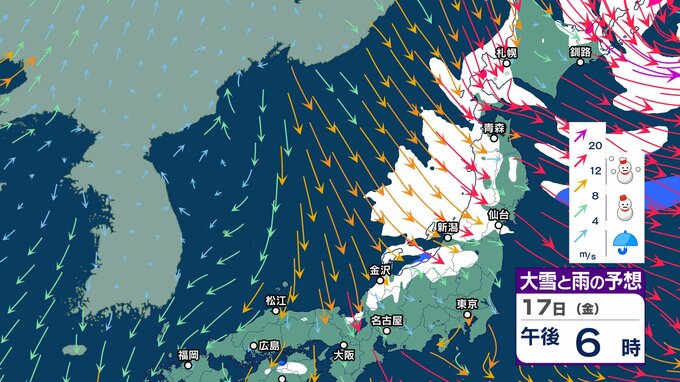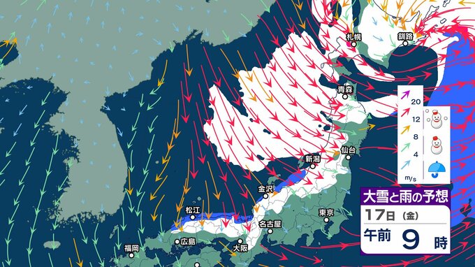 ニュースクリップ 来週は一転…北・東日本・近畿は1月20日ごろから「かなり高く」この時期としては10年に一度程度しか起きないような著しい高温となる可能性 気象庁が「高温に関する早期天候情報」発表 2025年1月14日(火) 15:51 国内 天気 17日 大雪と雨のシミュレーション