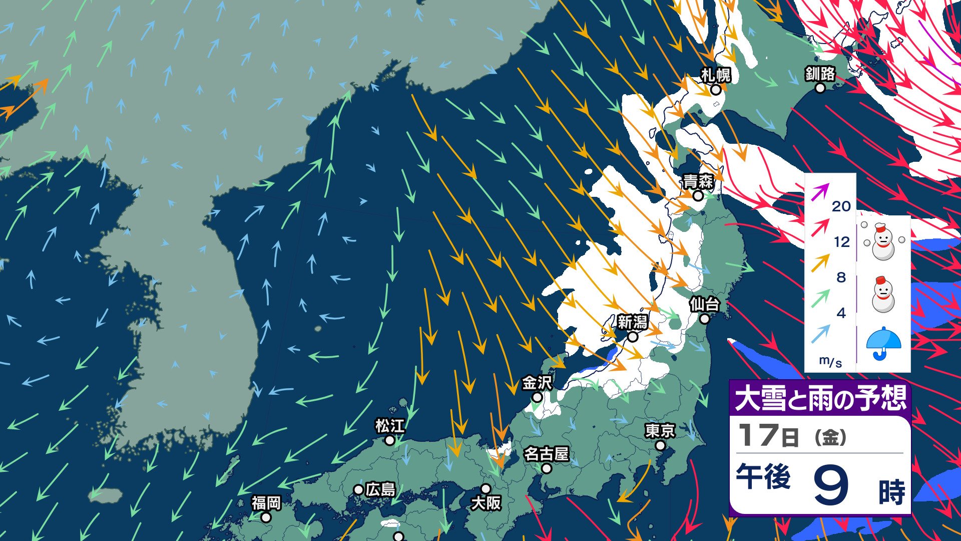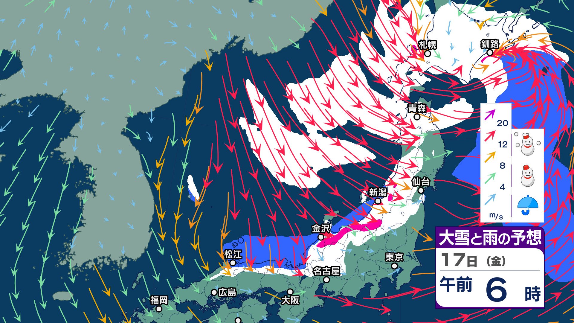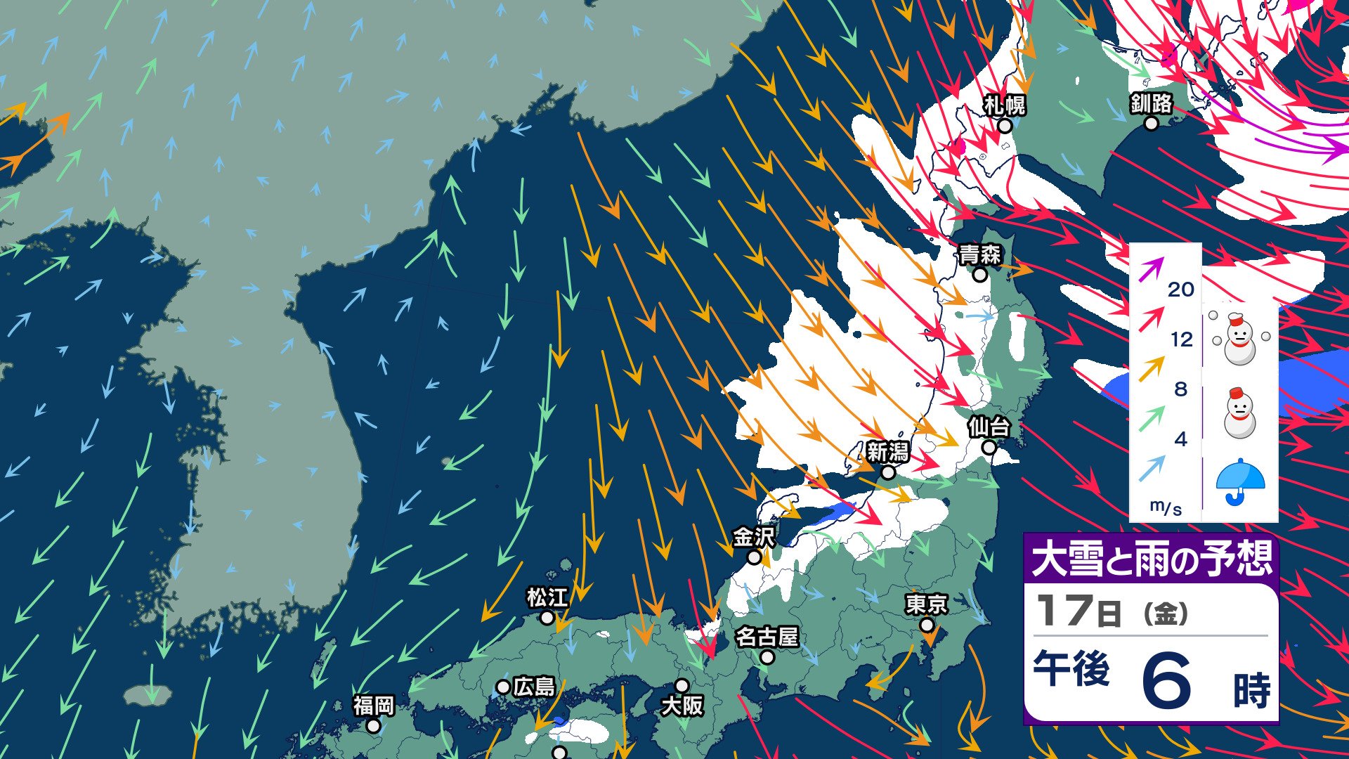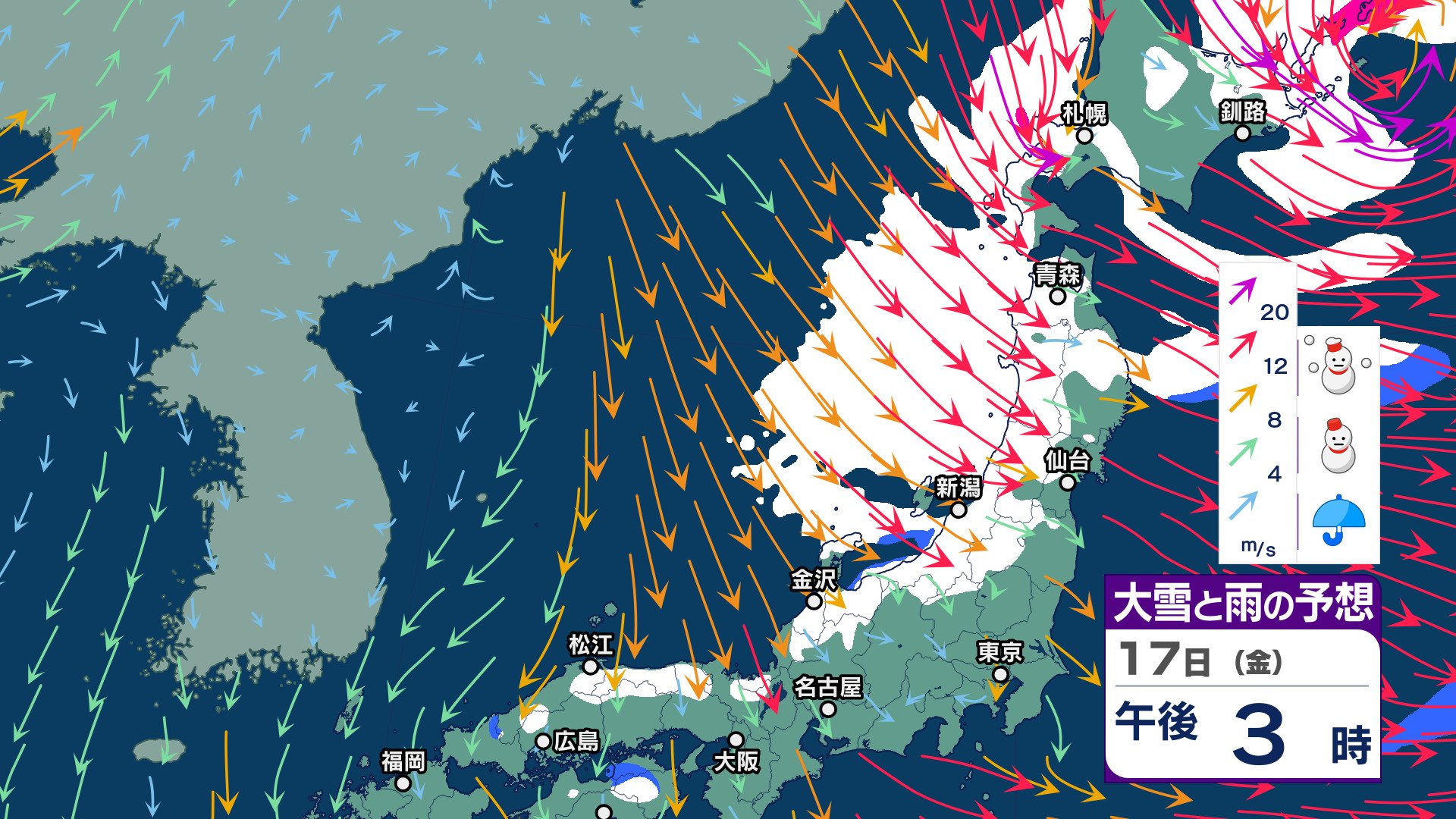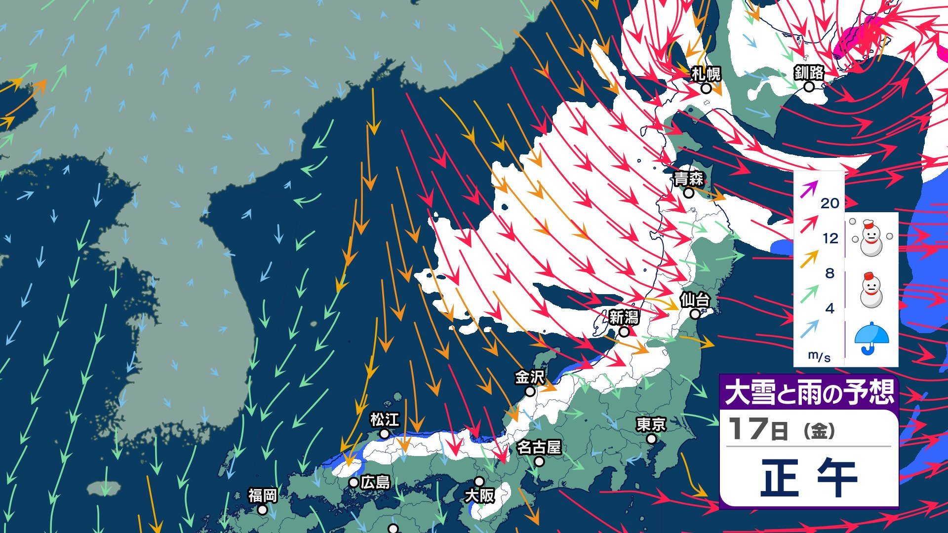 ニュースクリップ 15日午後の北陸は次第に冬型の気圧配置へ “嵐の使者” 上空にマイナス30℃以下の寒気【気象情報 15日午前7時更新】夜遅くにかけて落雷や竜巻などの激しい突風、ひょうに注意【大雪と雨シミュレーション18午後3時まで】 2025年1月15日(水) 07:39 国内 天気 17日 大雪と雨のシミュレーション