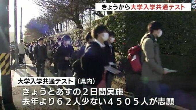 2日間で実施される大学入学共通テストで、県内の志願者数は、去年より62人少ない4505人となっています。
