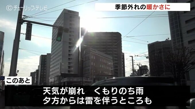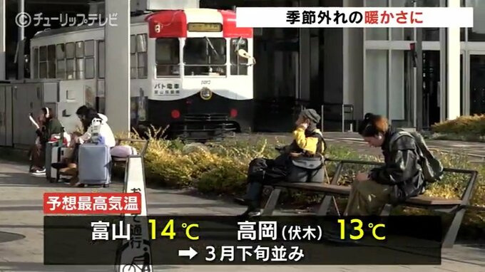 このあとも気温はあがり日中の予想最高気温は平年より7、8℃高く富山で14℃高岡の伏木で13℃と3月下旬並みの暖かさとなりそうです。