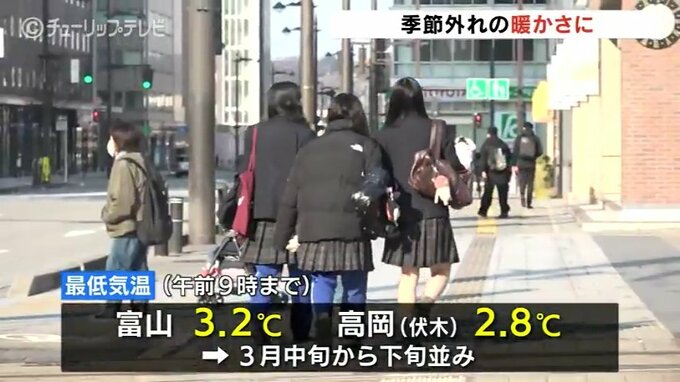 富山県内は気圧の谷や湿った空気の影響で雲に覆われています。ところどころ日差しも差し込み午前9時までの最低気温は富山市で3.2℃高岡の伏木で2.8℃など3月中旬から下旬並みの暖かさとなりました。