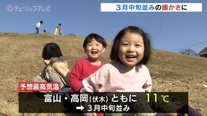 日中の予想最高気温は富山、高岡市の伏木ともに11℃と季節外れの暖かさだった20日を下回りますが、平年を5℃ほど上回り3月中旬並みとなりそうです。