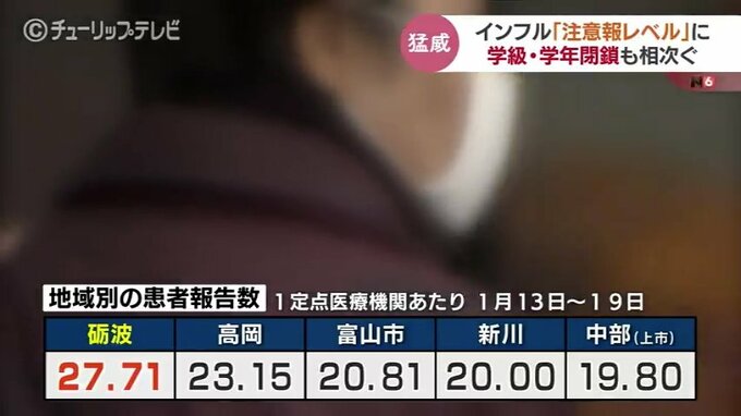 地域別では、砺波厚生センター管内が27.71人と最も多く、警報レベルに迫る勢いです。次いで高岡、富山市となっています。