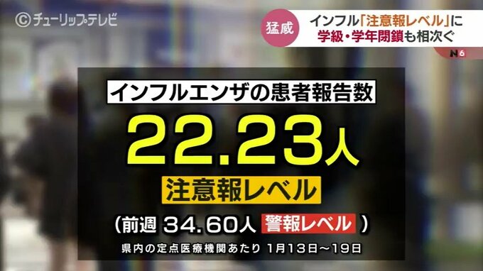 富山県内のインフルエンザ患者数が「警報レベル」から「注意報レベル」に減少しました。県は、依然として流行は収まっていないとして手洗いやうがいなどの感染対策を呼びかけています。