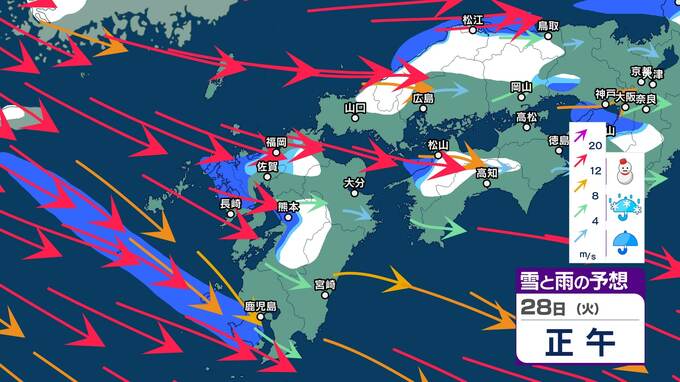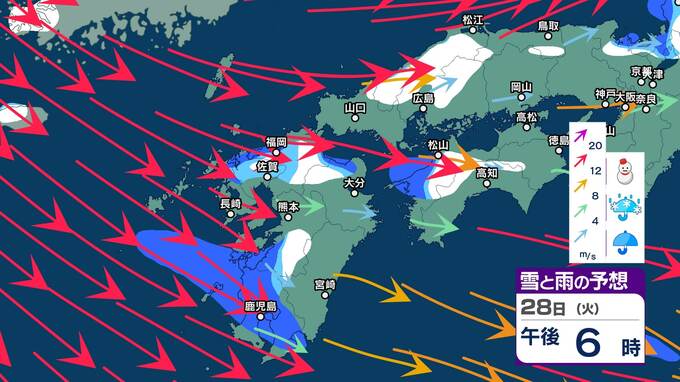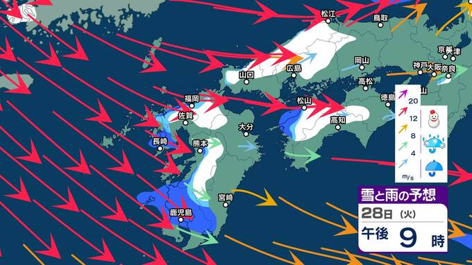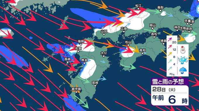 ニュースクリップ 【大雪情報】九州北部山地で雪に あす朝まで山口15㎝ 福岡・佐賀・長崎・大分・熊本県3㎝の降雪予想【雪と雨と風のシミュレーション】 2025年1月27日(月) 13:57 国内 天気 九州中四国 雪と雨と風のシミュレーション 28日(月)