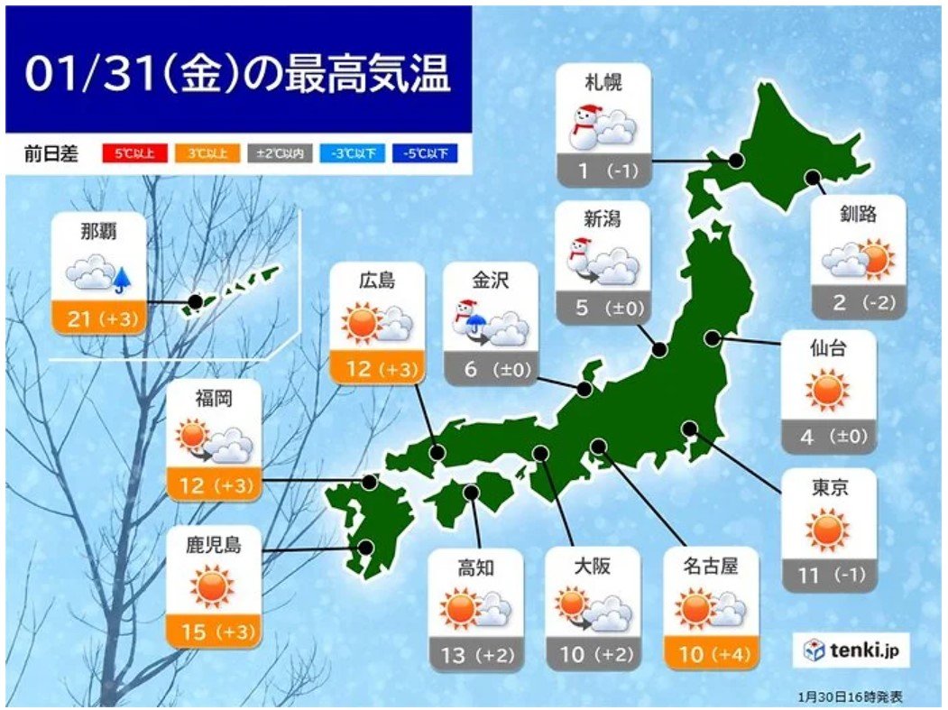 東海から九州は30日より3℃前後高く、冷たい風もおさまり、厳しい寒さは少し和らぐでしょう。