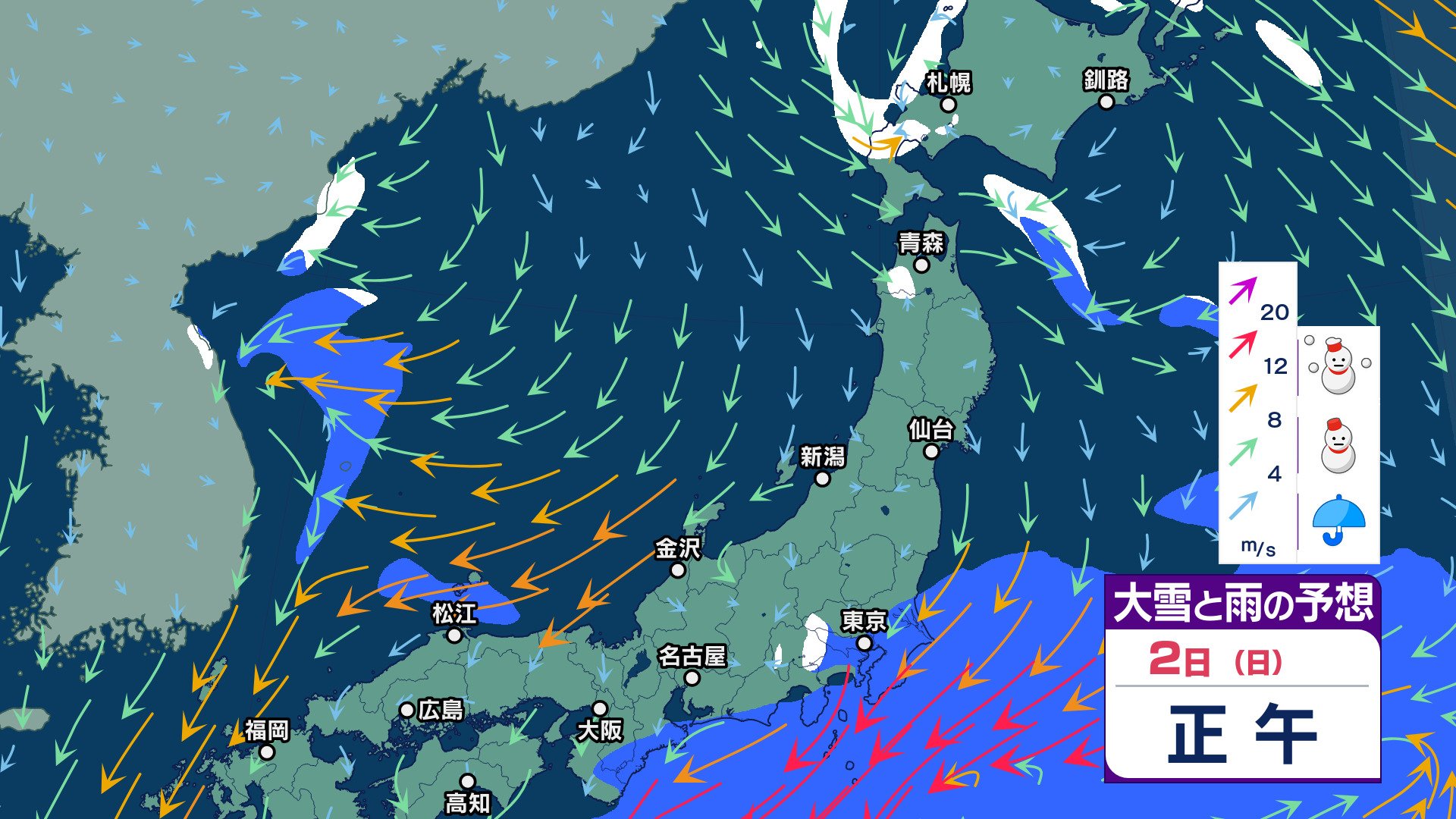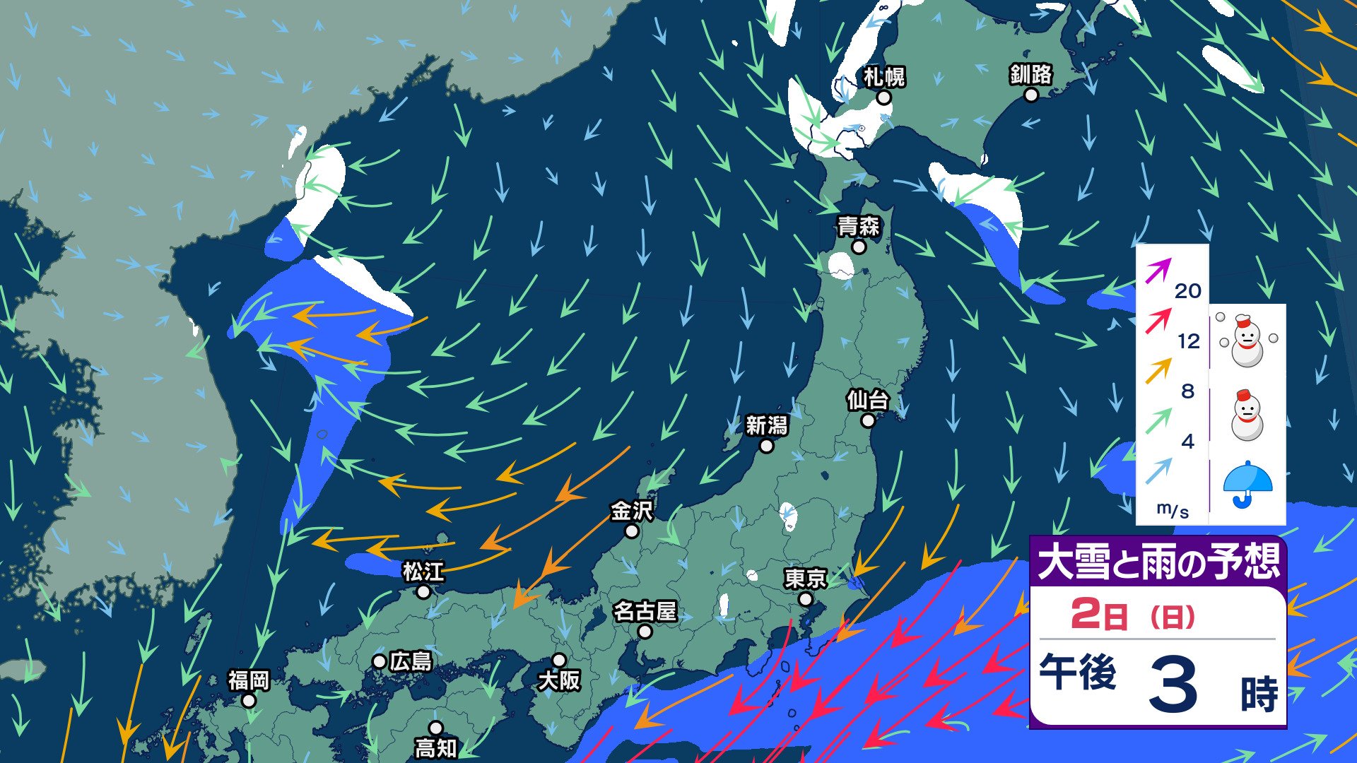 「この冬一番の強い寒気」4日頃から7日頃にかけて北日本~東日本にかけての日本海側や西日本を中心に大荒れ、警報級の大雪となる所も 北陸は“10年に1度程度”の降雪量になる可能性【雪と雨のシミュレーション】 2025年2月2日(日) 10:51 国内 暮らし・マネー 2日(日)雪雨シミュレーション