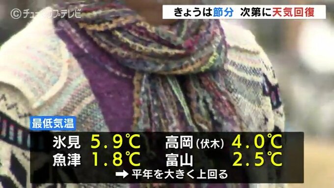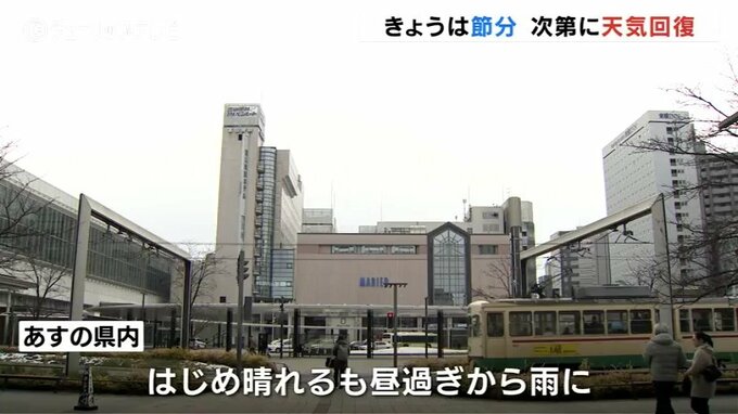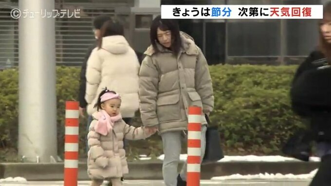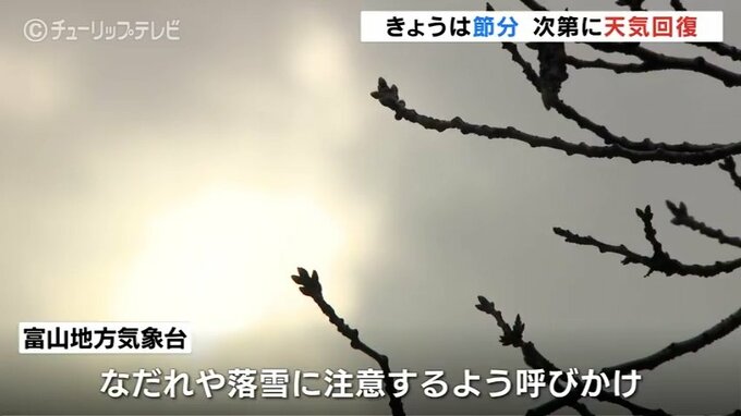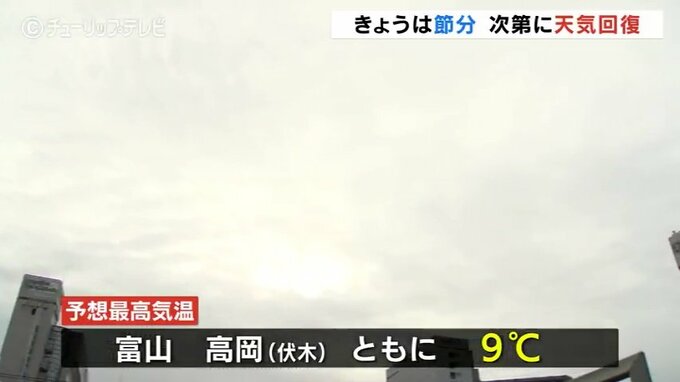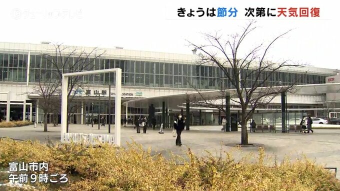 節分の富山県内は、広い範囲で曇り空となっています。このあとは次第に天気が回復し晴れとなる予想です。