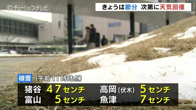 また午前11時の各地の積雪は猪谷で47センチ、富山と高岡の伏木で5センチなどとなっています。