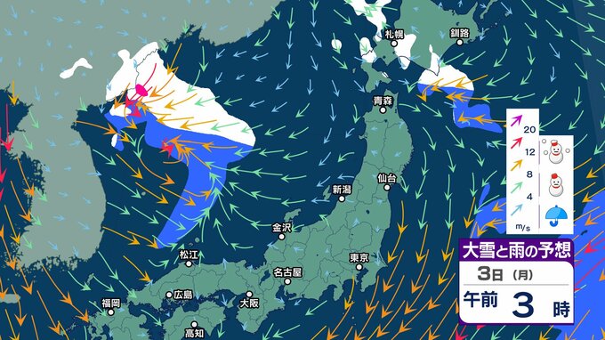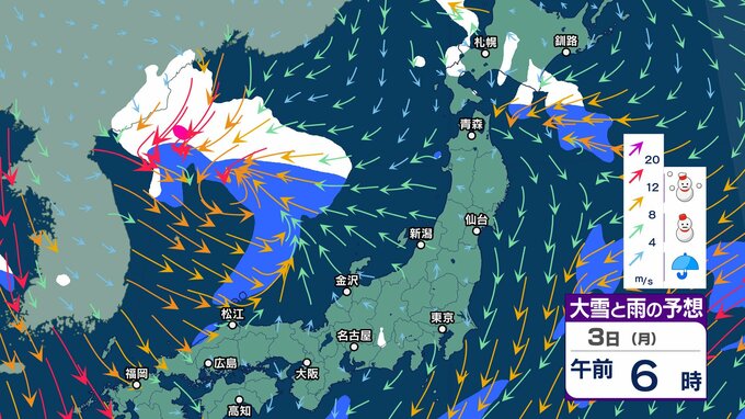 【大雪情報】北陸地方は4~7日頃にかけては大雪に 5日は平地も含めて「警報級の大雪」となる所も…予想より寒気が強まったり雪雲が同じ地域に流れ込み続けた場合は警報級の大雪となる地域拡大のおそれ【雪と雨のシミュレーション】 2025年2月2日(日) 16:58 国内 暮らし・マネー 3日(月)雪雨シミュレーション