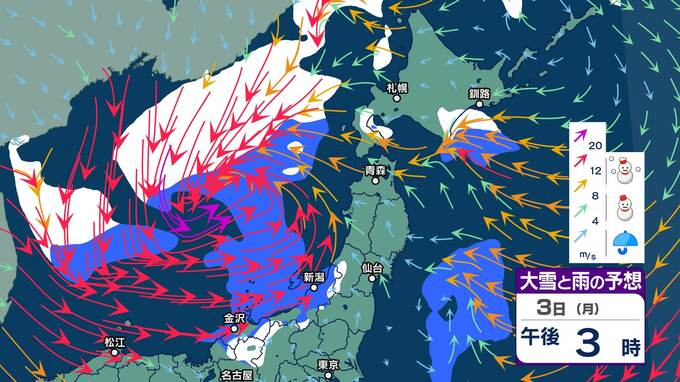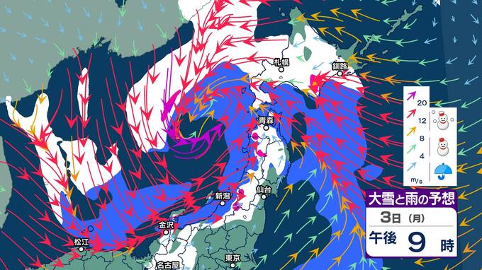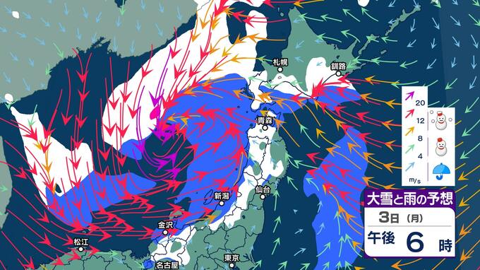 【大雪情報】東北日本海側は4~7日頃にかけて大雪に、海上では大荒れや大しけとなる見込み 警報級の大雪となる可能性【雪と雨と風のシミュレーション】 2025年2月3日(月) 11:01 国内 暮らし・マネー 3日(月)大雪と雨と風のシミュレーション