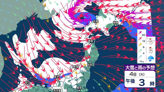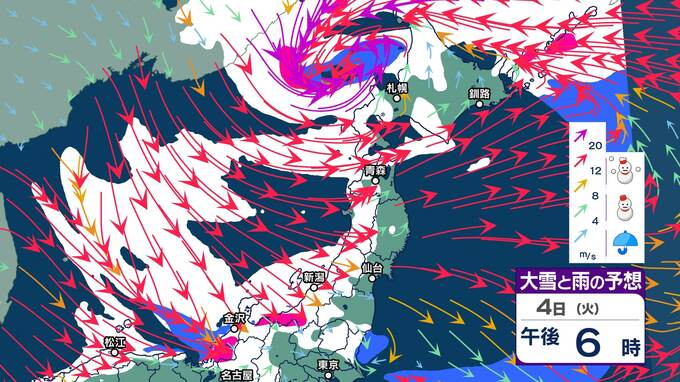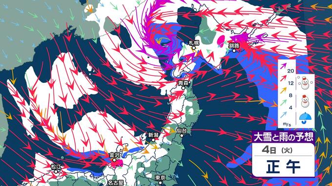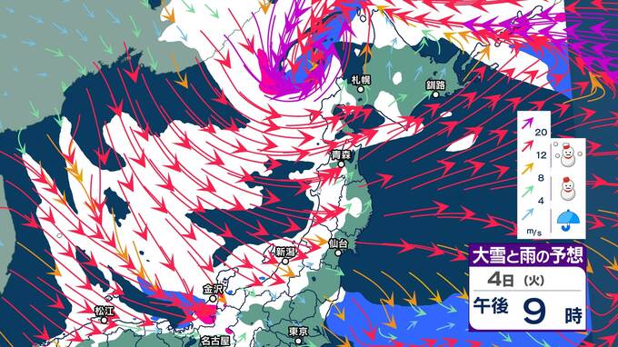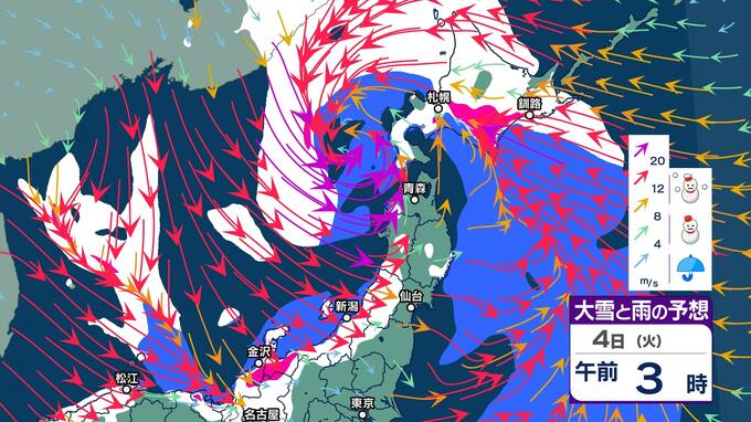 【大雪情報】東北日本海側は4~7日頃にかけて大雪に、海上では大荒れや大しけとなる見込み 警報級の大雪となる可能性【雪と雨と風のシミュレーション】 2025年2月3日(月) 11:01 国内 暮らし・マネー 4日(火)大雪と雨と風のシミュレーション