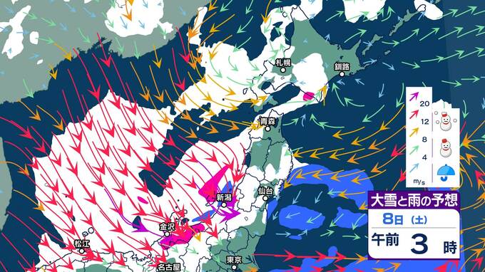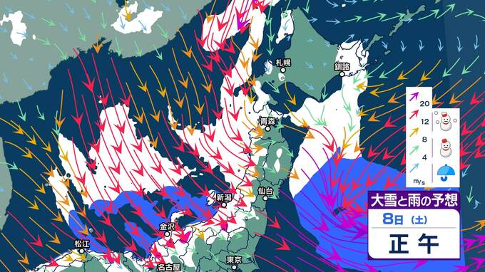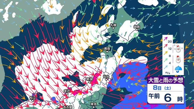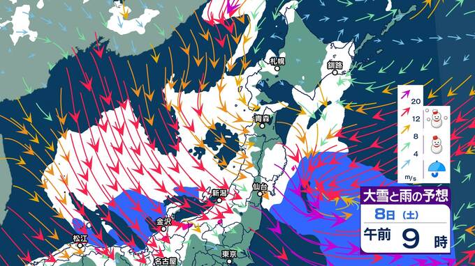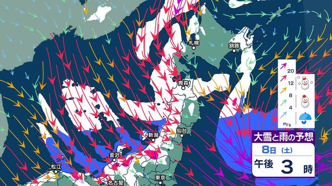 【大雪情報】東北日本海側は4~7日頃にかけて大雪に、海上では大荒れや大しけとなる見込み 警報級の大雪となる可能性【雪と雨と風のシミュレーション】 2025年2月3日(月) 11:01 国内 暮らし・マネー 8日(土)大雪と雨と風のシミュレーション