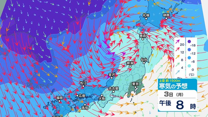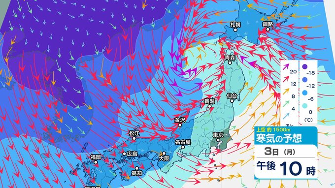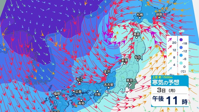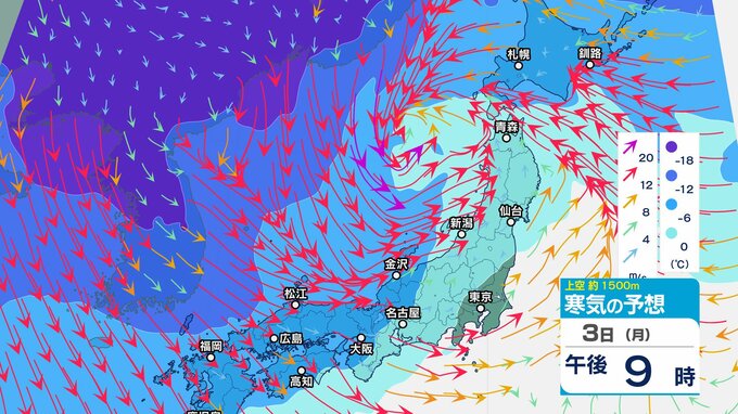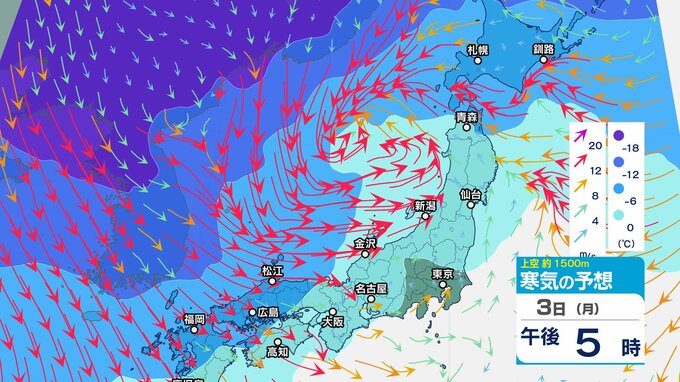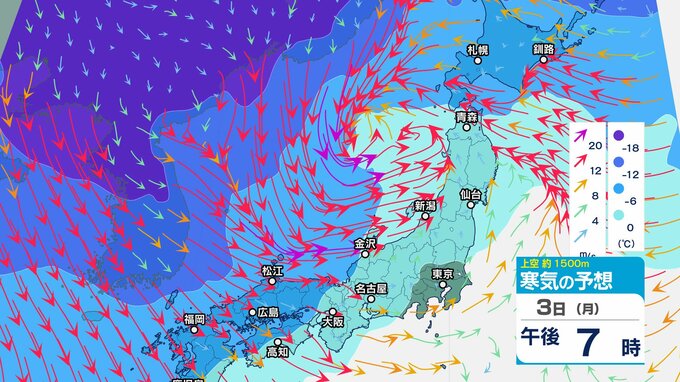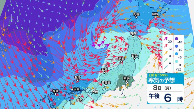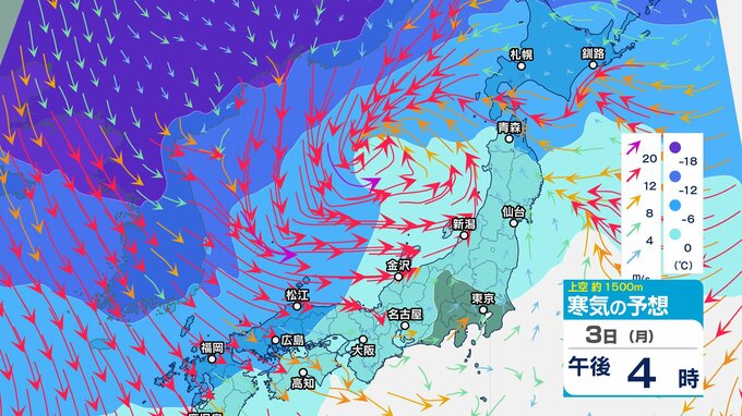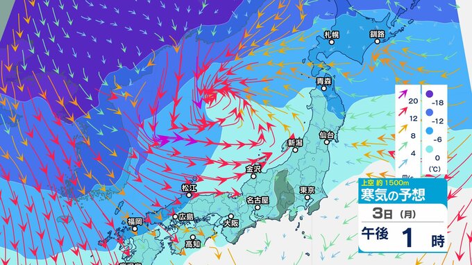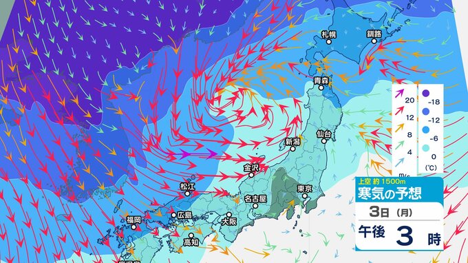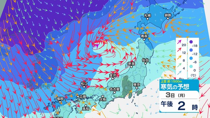 【通行止め】3日夜遅くから(時間未定)国道359号(富山・石川県境)立ち往生予防のため 県境付近10㎞【上空の寒気のシミュレーション1時間ごと】 2025年2月3日(月) 12:20 国内 暮らし・マネー 3日(月)上空1500メートルの寒気の動き