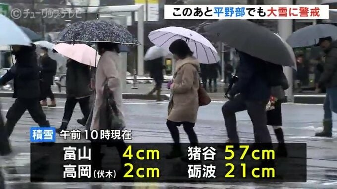 午前10時までの積雪は、富山で4センチ、富山市猪谷で57センチ、高岡市伏木で2センチ、砺波で21センチを観測しています。