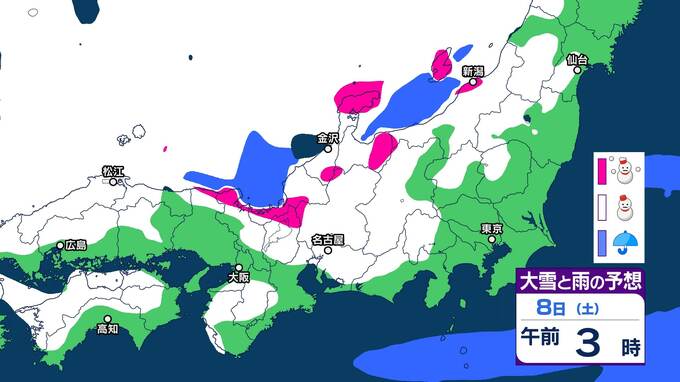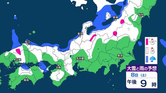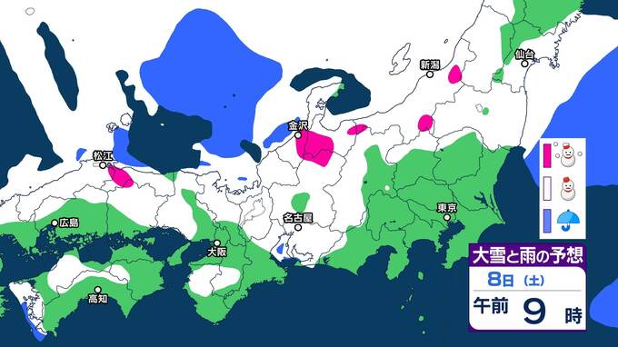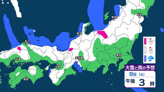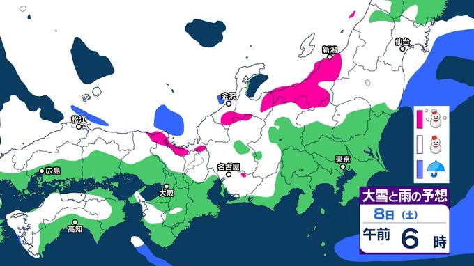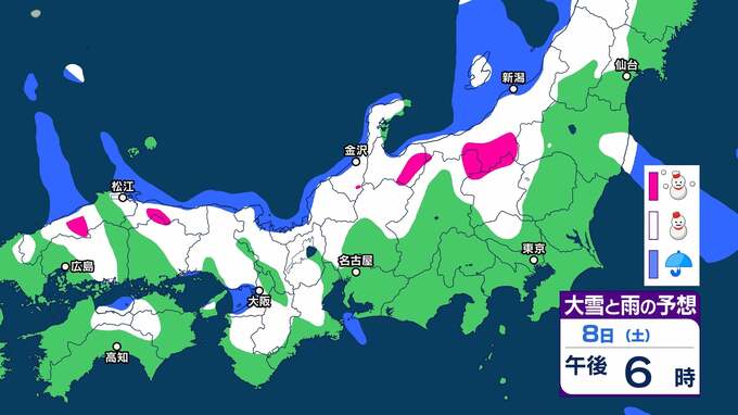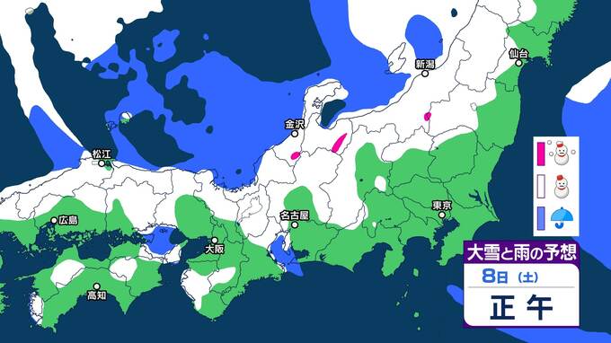 【大雪情報】近畿北部6日にかけて断続的に強い雪が降る見込み あす朝まで山地60㎝平地40㎝ 近畿中部山地30㎝の予想降雪 積雪や路面の凍結による交通障害に十分注意【大雪と雨のシミュレーション】 2025年2月4日(火) 14:00 国内 天気 8日(土)大雪と雨のシミュレーション