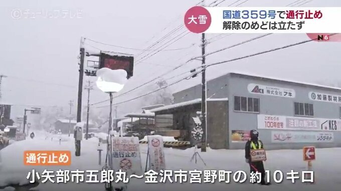 富山県と石川県は国道359号の富山県と石川県の県境付近約10キロを通行止めにしていて、富山県側の小矢部市五郎丸では通行止めを知らせる看板が設置されています。