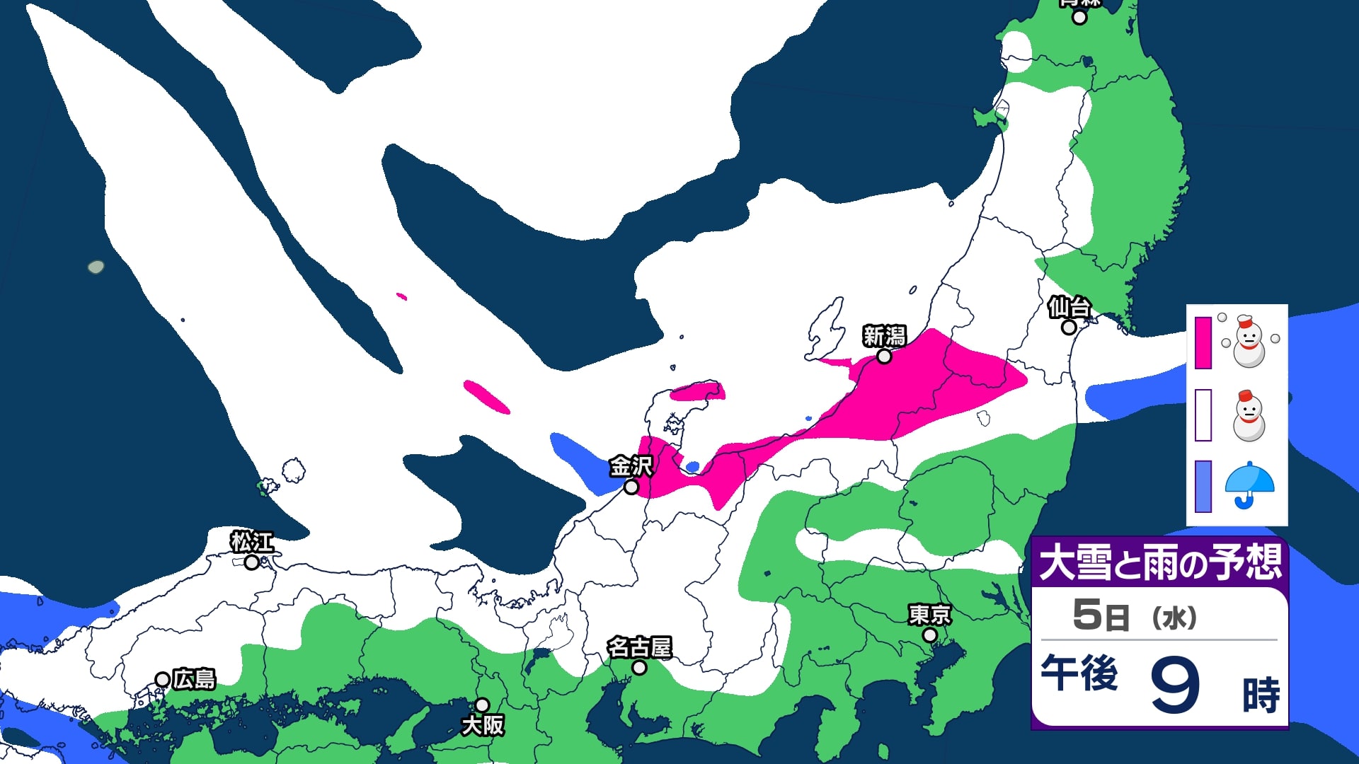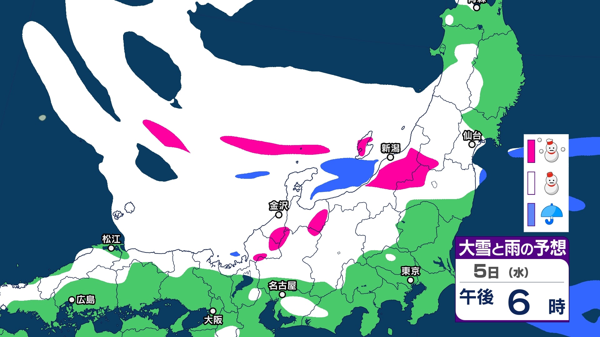 【大雪情報】長野県・関東地方北部は6日昼過ぎにかけて大雪となる所も…警報級の大雪となる可能性 その後も降雪は続き積雪多く 交通障害に注意・警戒し、なだれにも注意を【雪と雨のシミュレーション】 2025年2月5日(水) 13:24 国内 暮らし・マネー 5日(水)雪と雨のシミュレーション