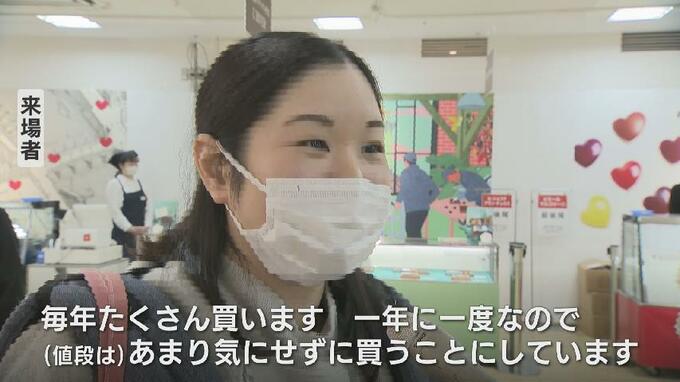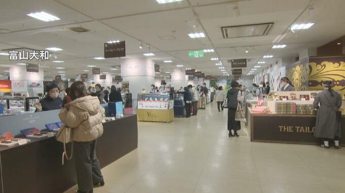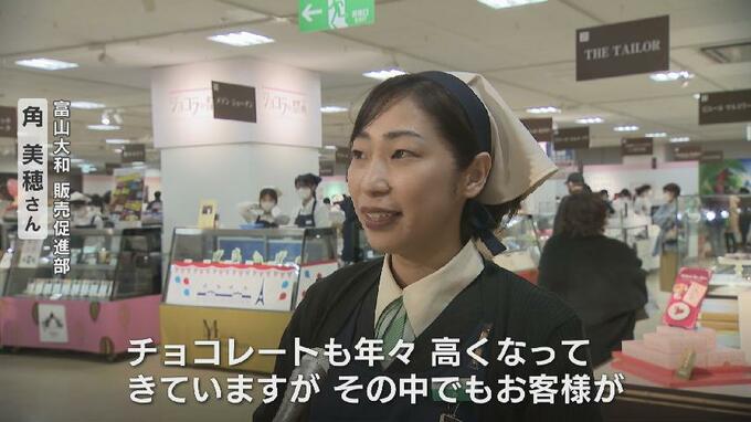 富山大和によりますと、カカオの高騰などの影響でチョコの価格は去年に比べて1割ほど値上がりしたということですが、今のところ客足には影響していないということです。