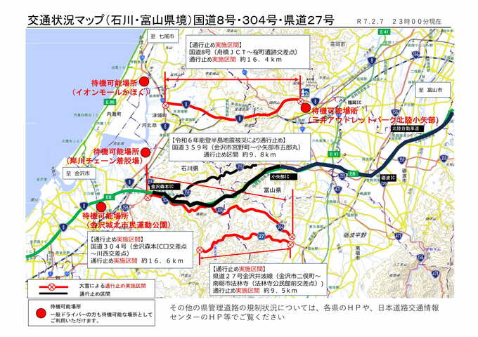 国土交通省富山河川国道事務所は、集中除雪作業を実施するため7日午後11時に国道8号・304号・県道27号の一部区間について、全面通行止めとしました。