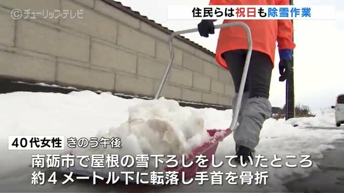10日南砺市では屋根の雪下ろしをしていた40代の女性がおよそ4メートル下に転落し、手首を骨折する重傷です。