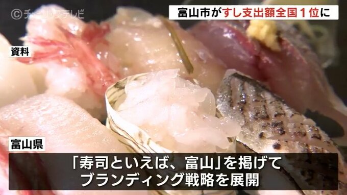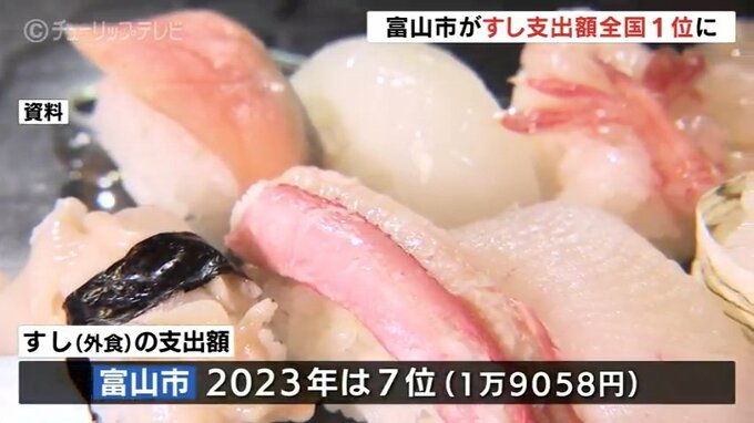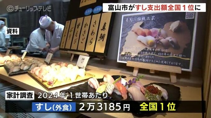 この家計調査は去年1年間の消費について、全国の県庁所在地と政令指定都市を対象に調査したもので、富山市の1世帯あたりのすしの支出額は2万3185円と全国トップとなりました。2023年の7位から順位を大きく上げた形です。