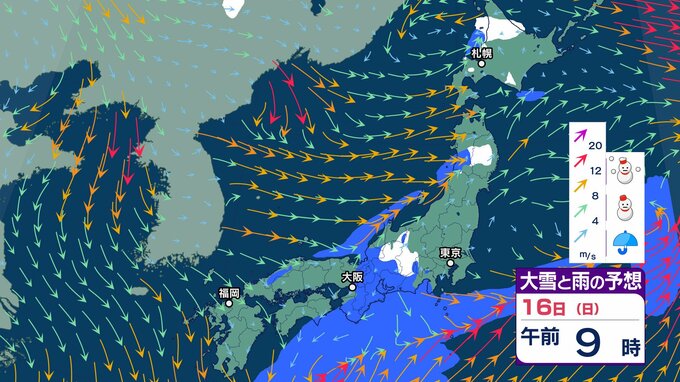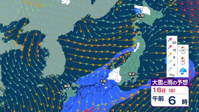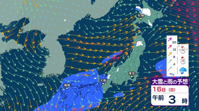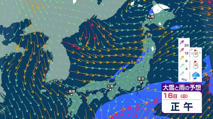 ニュースクリップ 低気圧が急速に発達…13日は日本海側を中心に “嵐の使者” 局地的に大雪も【大雪と雨と風のシミュレーション】暴風雪による交通障害に警戒 太平洋側は南風から北風に変わり関東は気温急降下 2025年2月12日(水) 19:30 国内 天気 16日(日)雪と雨と風のシミュレーション