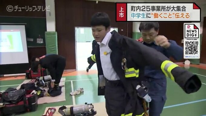 理容店のブースではマネキンの髪をカットや消防署のブースで防火衣を身に付けるなど、中学生が職業について学ぶ催しが14日、富山県上市町で開催されました。
