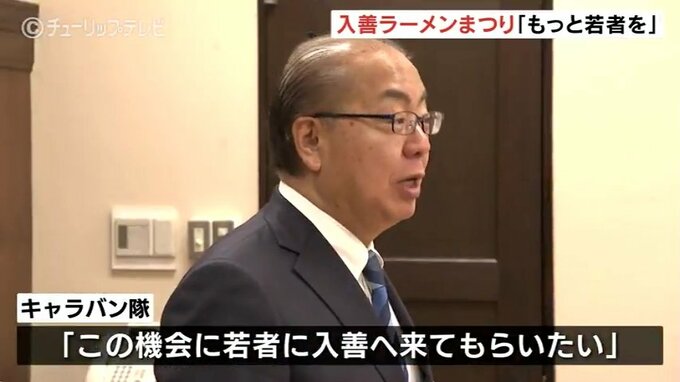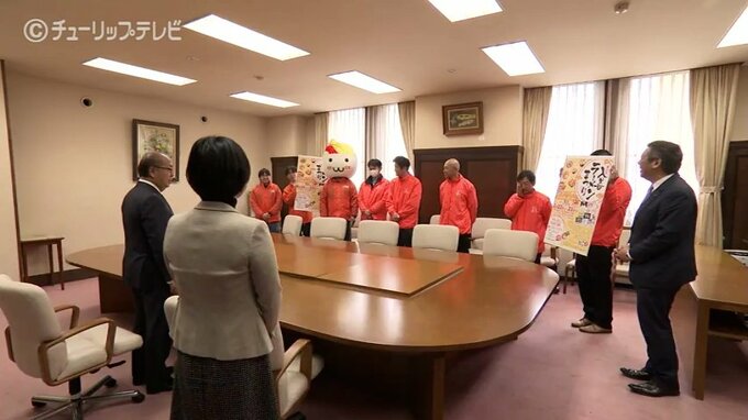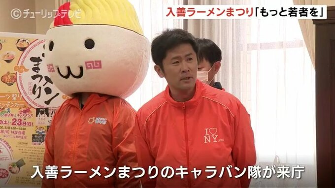 キャラバン隊は、新田知事にこの機会に入善へ来てもらいたいと意気込みを伝えました。入善ラーメンまつりは2月22日から2日間です。