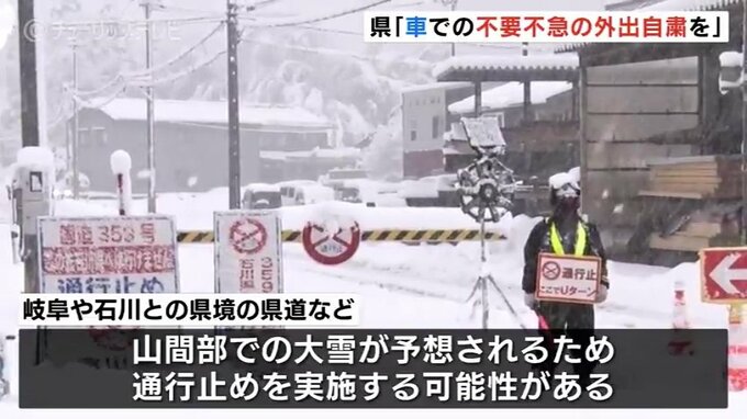 山間部での大雪が予想されるため、岐阜や石川との県境の県道でも通行止めを実施する可能性があるとしています。