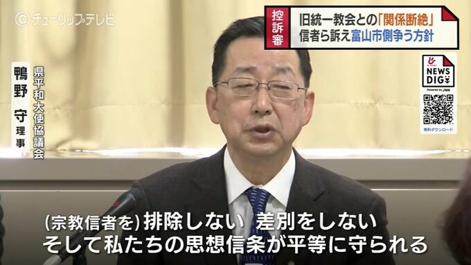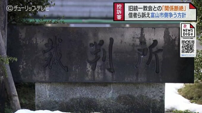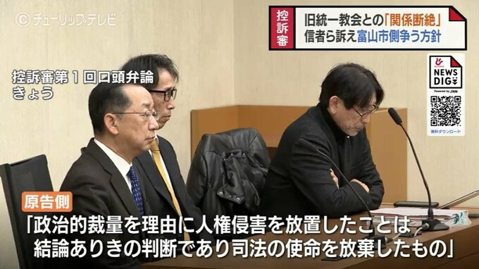 旧統一教会との関係断絶をめぐる富山市議会の決議や市長の発言について、信者の男性らが損害賠償を求めた裁判の控訴審が19日始まりました。