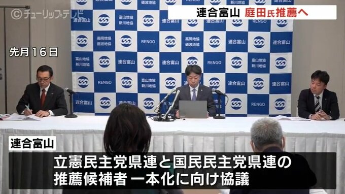ニュースクリップ 夏の参院選富山選挙区 連合富山が会社役員の庭田幸恵氏を推薦へ 来月連合本部に申請 立憲民主県連の候補者選定が難航 2025年2月20日(木) 12:26 国内 ことし夏に予定されている参議院選挙の富山選挙区の推薦候補者について、富山県内の労働組合でつくる連合富山は20日までに国民民主党の公認候補を推薦する方向で調整に入りました。連合富山によりますと、国民民主…