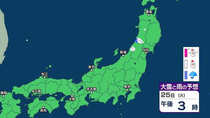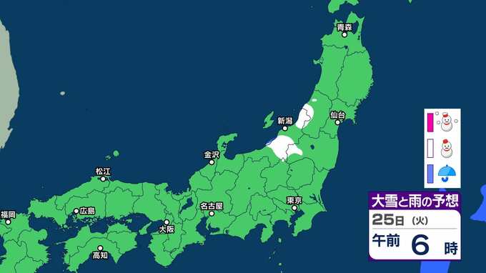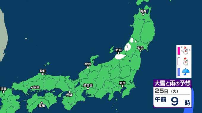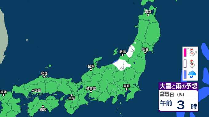 ニュースクリップ 【大雪情報 】あす朝までに最大70センチの降雪予測…上空5500メートルに氷点下33℃の寒気【気象庁】25日まで「早期注意報」北海道・青森・秋田・富山・石川・福井に「警報級の大雪」の可能性【雪と雨のシミュレーション】 2025年2月21日(金) 08:10 国内 天気 25日(火)大雪と雨のシミュレーション