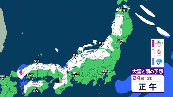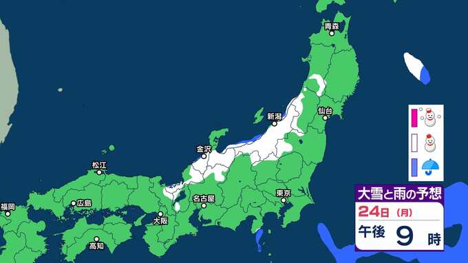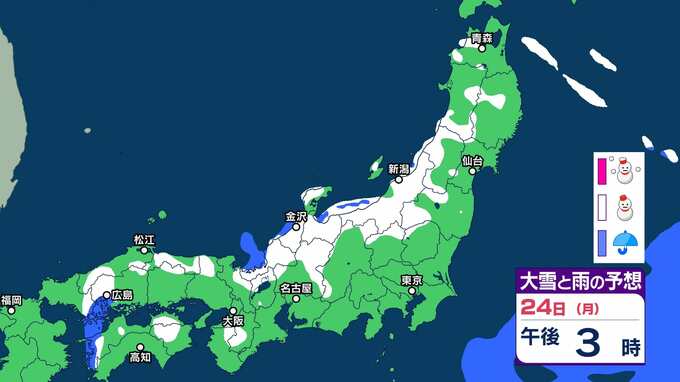 ニュースクリップ 【早期注意情報】石川・秋田は「大雪警報」発表の可能性が高い 富山・青森・秋田・福井・鳥取は「大雪警報」発表の可能性ある【雪と雨のシミュレーション】 2025年2月21日(金) 10:00 国内 天気 24日(月)大雪と雨のシミュレーション