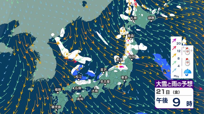 ニュースクリップ 【3連休】強い寒気は西日本まで南下…近畿北部や山陰などの日本海側 “広い範囲” で雪【雪と雨のシミュレーション】 2025年2月21日(金) 17:36 国内 天気 21日(金)雪と雨のシミュレーション