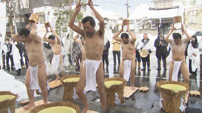 厳しい寒さの中、富山市の長清寺で水行に臨んだのは、副住職の串田教語さんら7人の僧侶です。