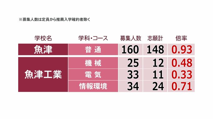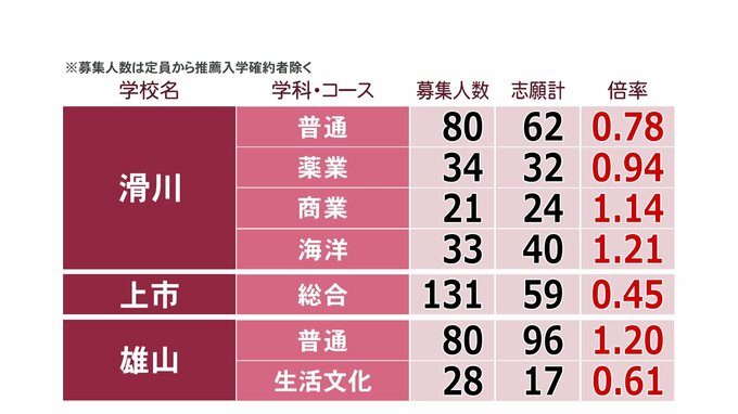 ニュースクリップ 富山県立高校入試 2025年度志願倍率 富山中部(探究科学科 2.34倍) 富山商業(ビジネスマネジメント科 2.20倍)…一方 22校39学科で定員割れ【令和 7年度 全校全学科掲載】 2025年2月25日(火) 17:20 国内 新川地域 高校志願倍率(全日制課程一般) 入善普通科は0.76倍桜井普通科は1.01倍です。 魚津の普通科は0.93倍で定員割れ、魚津工業はすべての学科で定員割れです。 滑川・海洋科は1.21倍。上市・総合学科は0.45倍、雄山の普通科は1.20倍です。