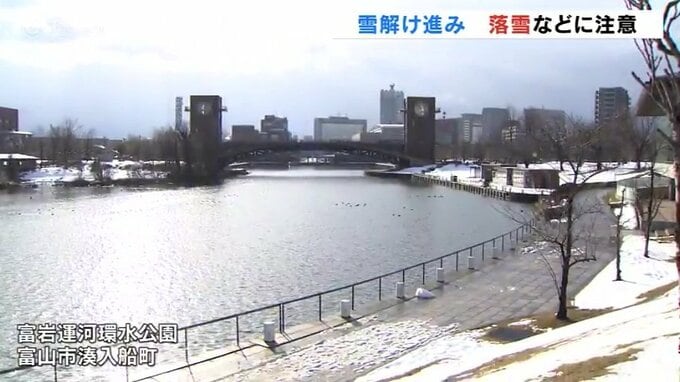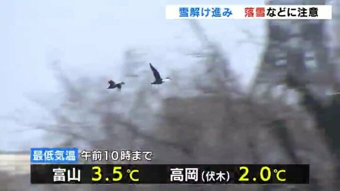 日中の最高気温は富山で9℃、高岡市伏木で8℃の見込みで、前日に続き雪解けが進むため屋根からの落雪などに注意が必要です。