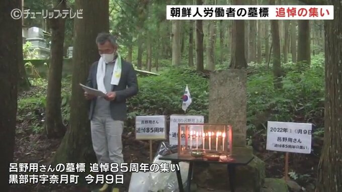 ニュースクリップ 黒部川のダム建設工事で亡くなった朝鮮人労働者の墓標 85年の命日にあわせ追悼の集い 富山・黒部市 2022年10月11日(火) 12:05 国内 戦前、黒部川のダム建設の工事現場で亡くなったとみられる朝鮮人労働者の墓標が見つかり、85年の命日にあわせて追悼の集いが9日富山県黒部市宇奈月町で行われました。見つかったのは、戦前相次いだ黒部川の電源開…