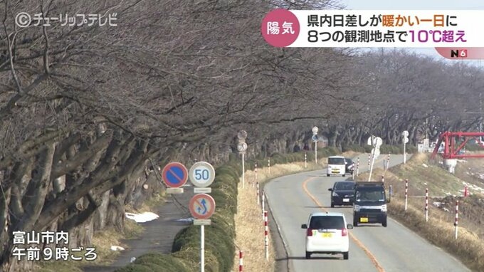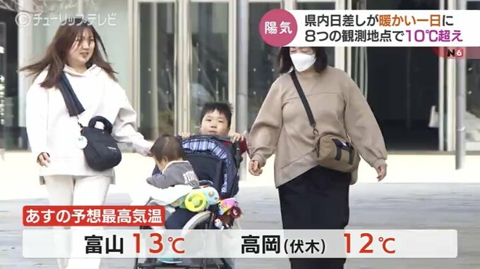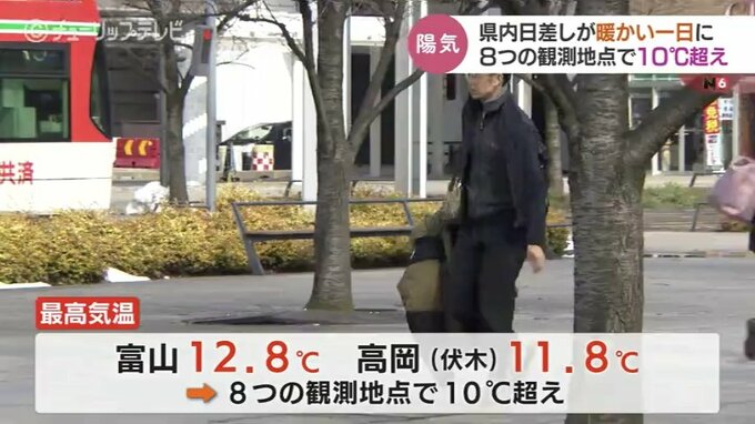 日中にかけてはさらに気温が上がり最高気温は富山で12.8℃、高岡市の伏木で11.8℃など、10ある観測地点の8か所で10℃を超えました。