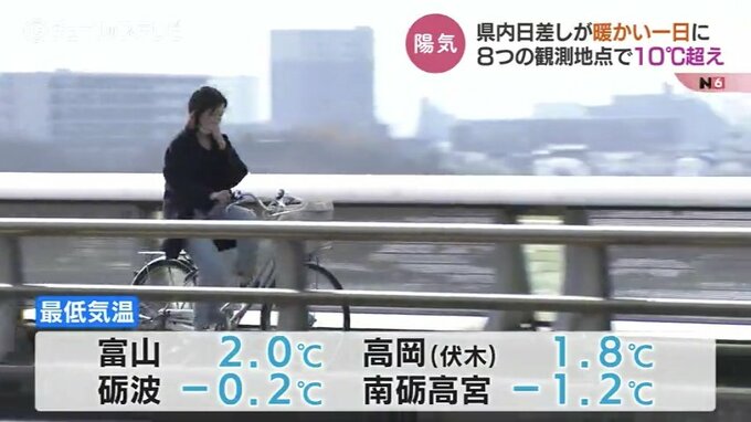 朝の最低気温は富山で2.0℃、高岡市の伏木で1.8℃など、広い範囲で3月上旬から下旬並みの暖かさとなりました。