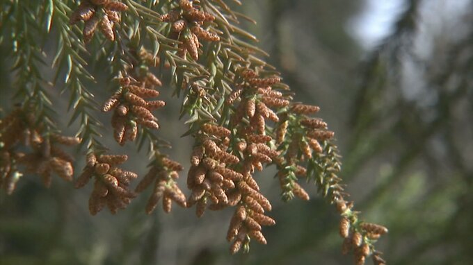 県森林研究所は、きょう3月1日に観測定点にあるスギの標準木で雄花の開花を確認。スギ花粉の本格的な飛散シーズンがはじまったと発表しました。